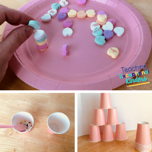 You’ll need candy hearts, paper plates (I per child) and a timer. Time students to see who has the highest stack of candy hearts in one minute. Try it a few times to see if their strategy changes! Finish Early? See how many hearts the kids can “stand” up on their sides in one minute.