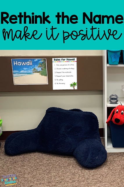 Last summer, I saw Dr. Jean speak at a local college and she suggested renaming the calm down spot to a fun name or the name of a place when you would actually want to go. So last school year, I renamed this area of my room and “Hawaii” was born. I printed out a photo of Hawaii and ran with it. I don’t have space in my classroom for an extra calm down area, so I took a chance and put Hawaii in my classroom library area.